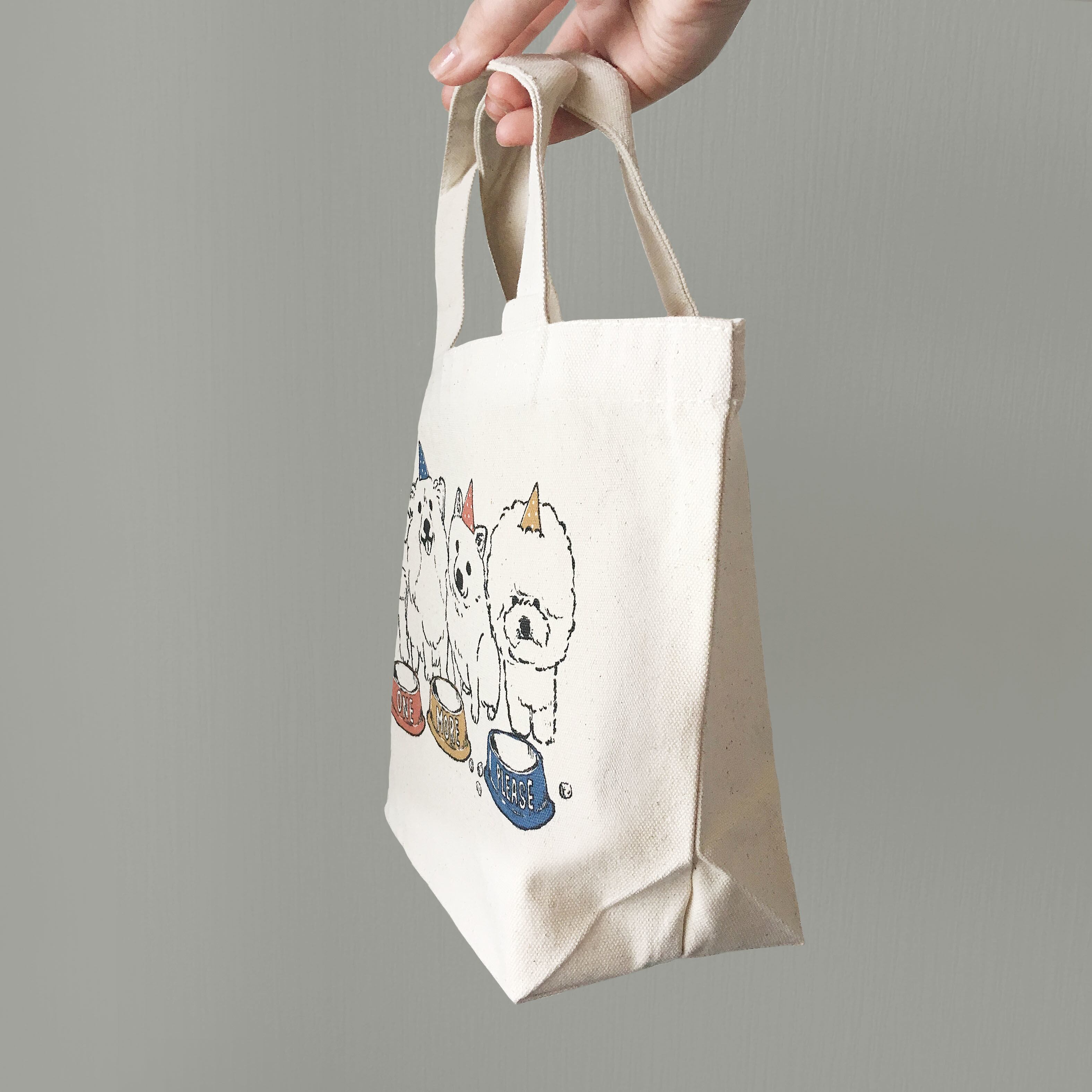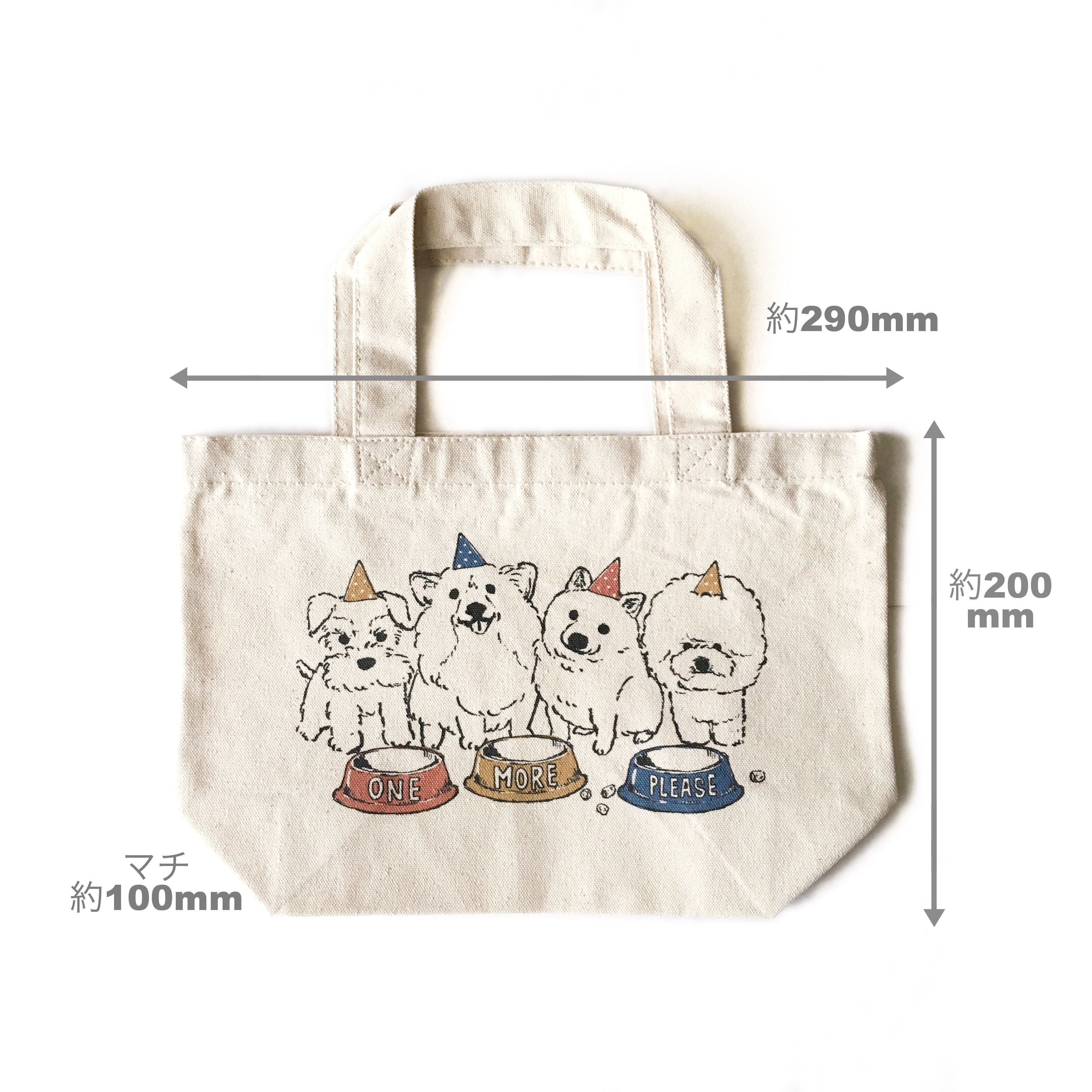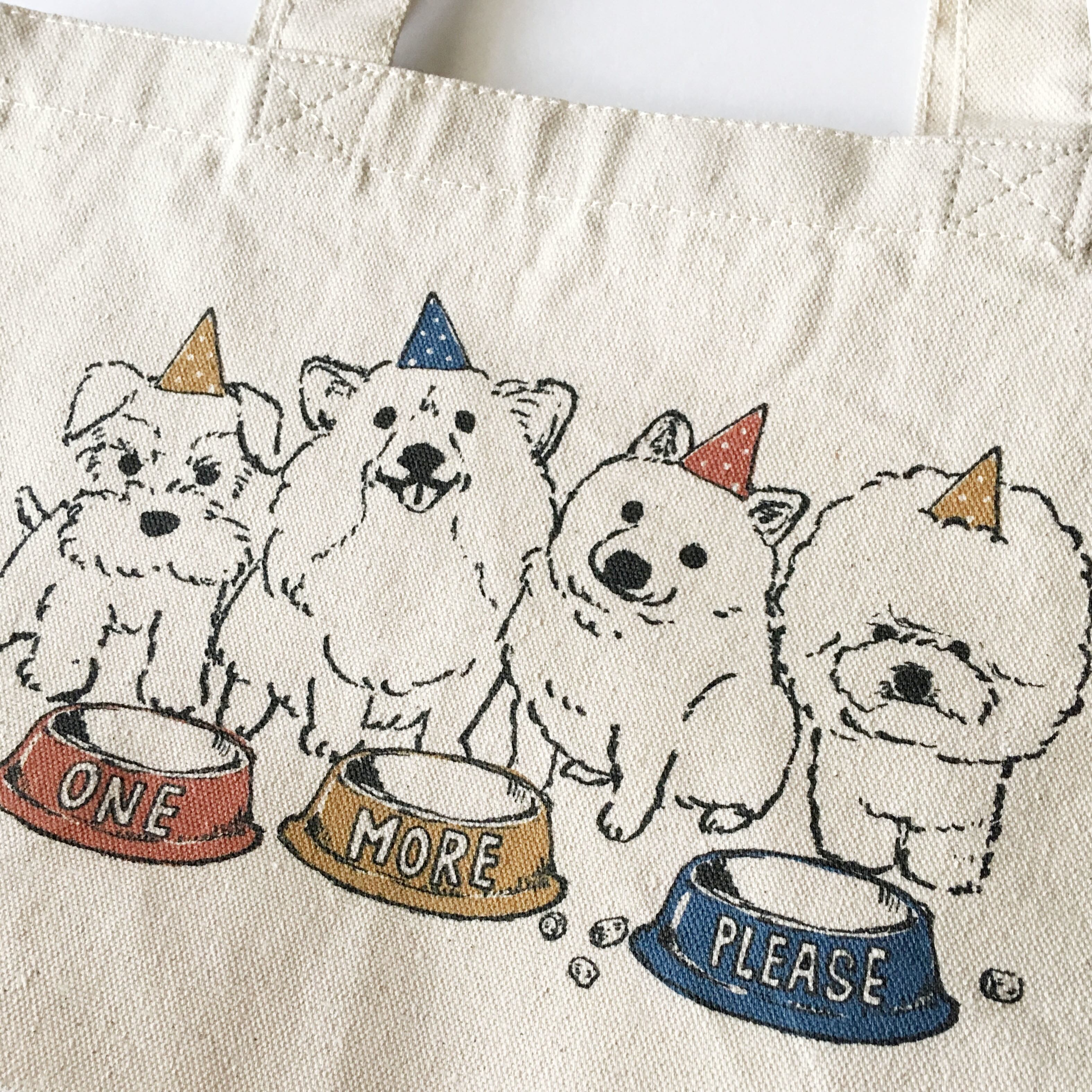 わんこのイラストが入った、丈夫なキャンバス生地のトートバッグです。おかわりがほしいと目で訴えています…