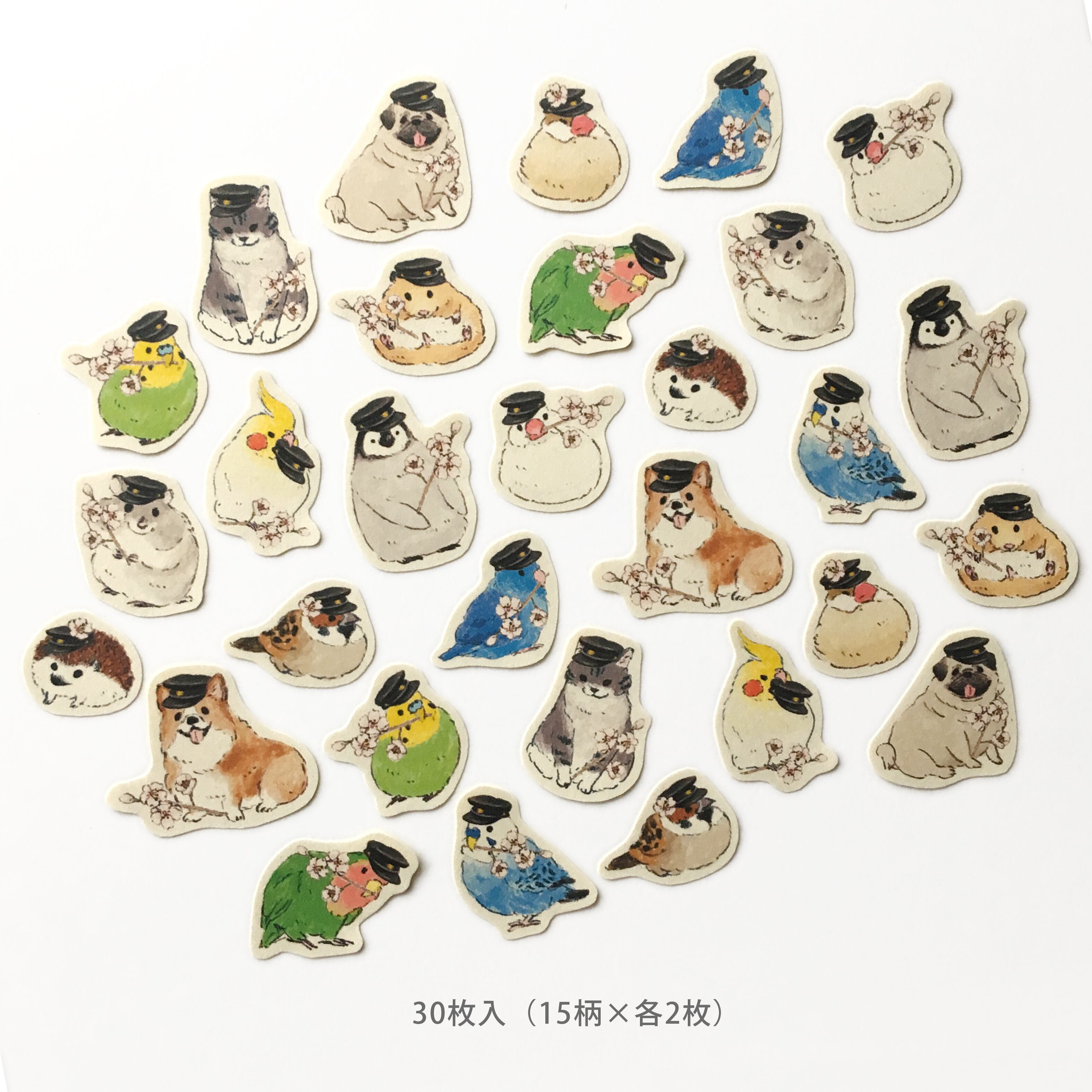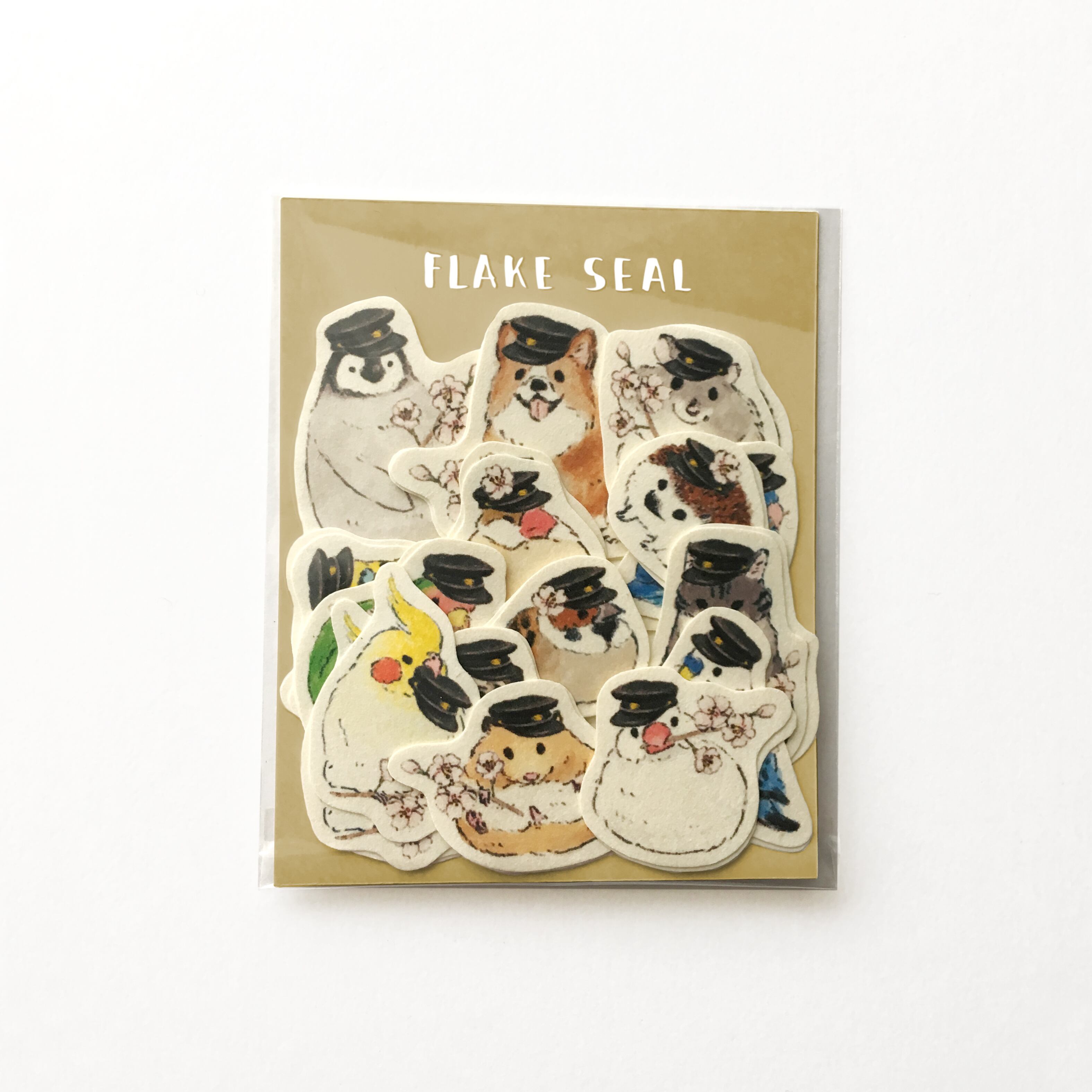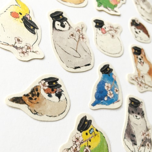 学生帽を被ったアニマルたちのフレークシールです。優しい風合いの手触りの良い和紙を使用しています。(イラストに影響が出ないよう、和紙の繊維が少ない紙を選んでるので分かりづらいかもしれません…)