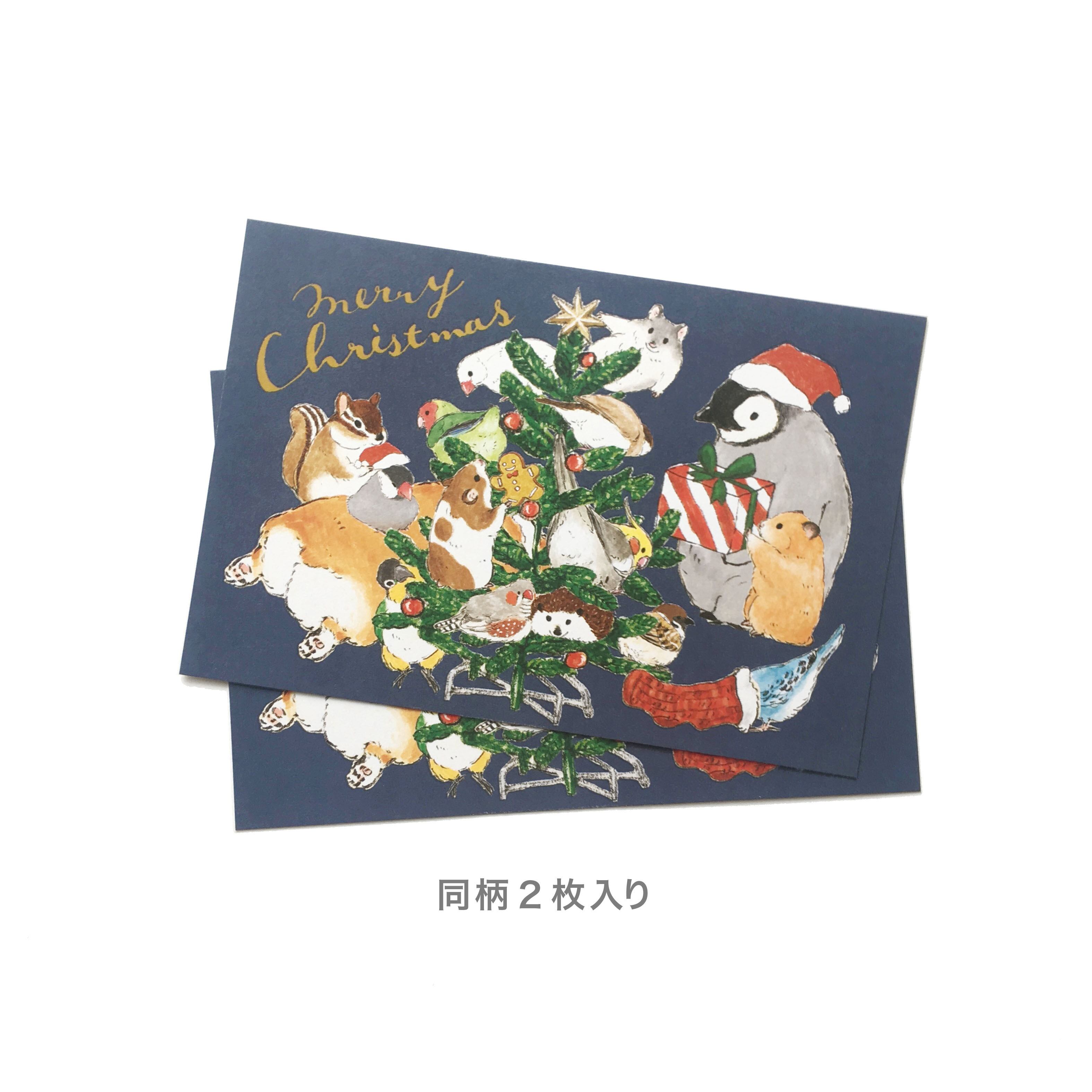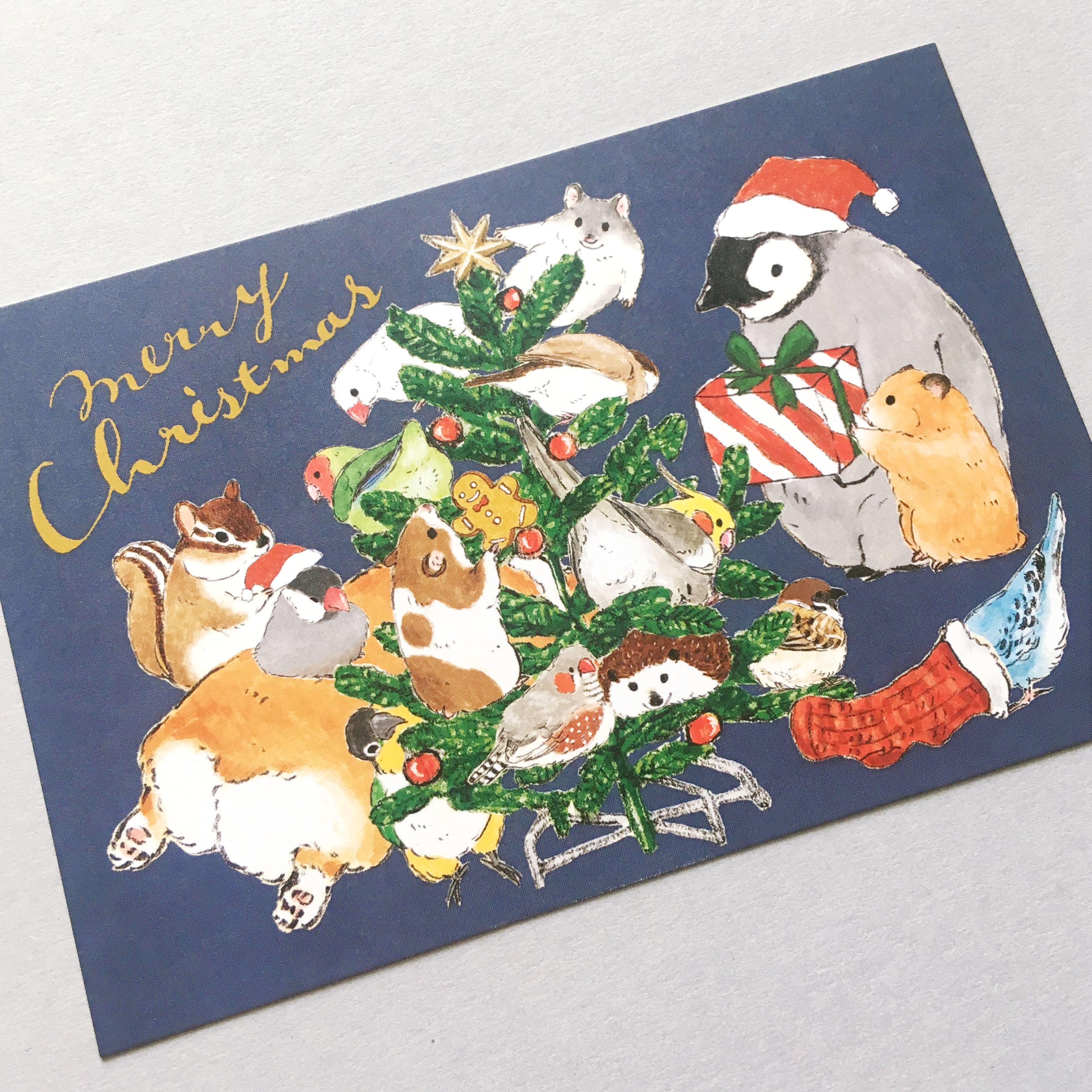ツリーにアニマル達が集合している、クリスマスのポストカードです。