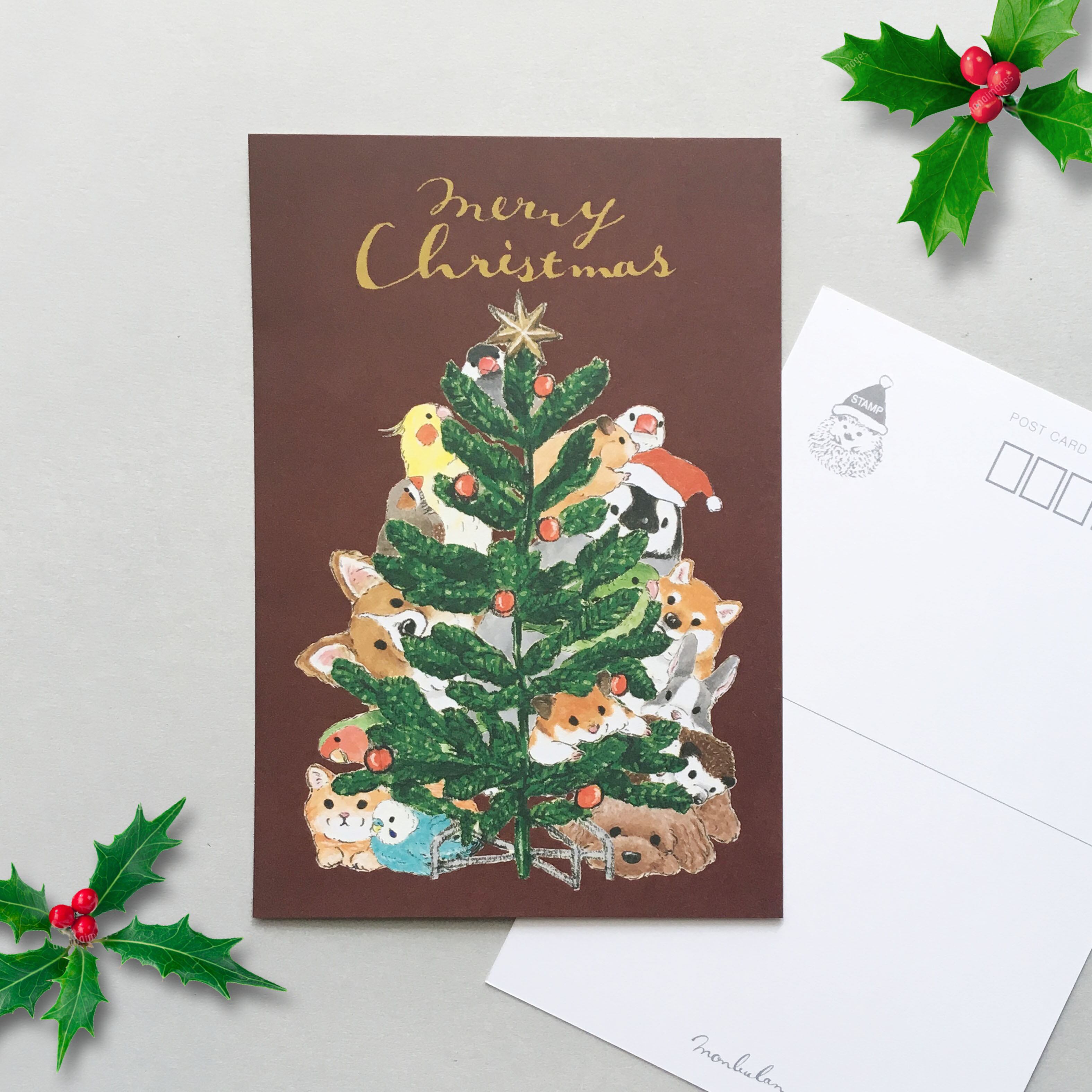 ツリーの影からひょっこり顔を出している、クリスマスポストカードです。