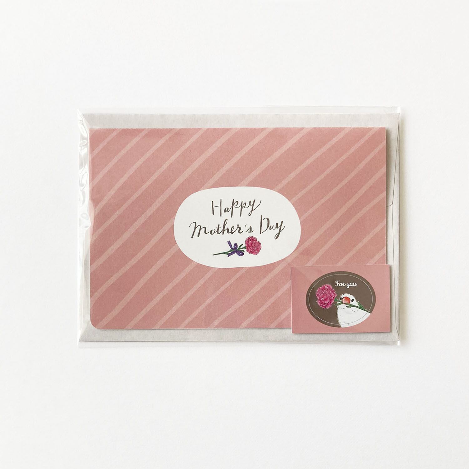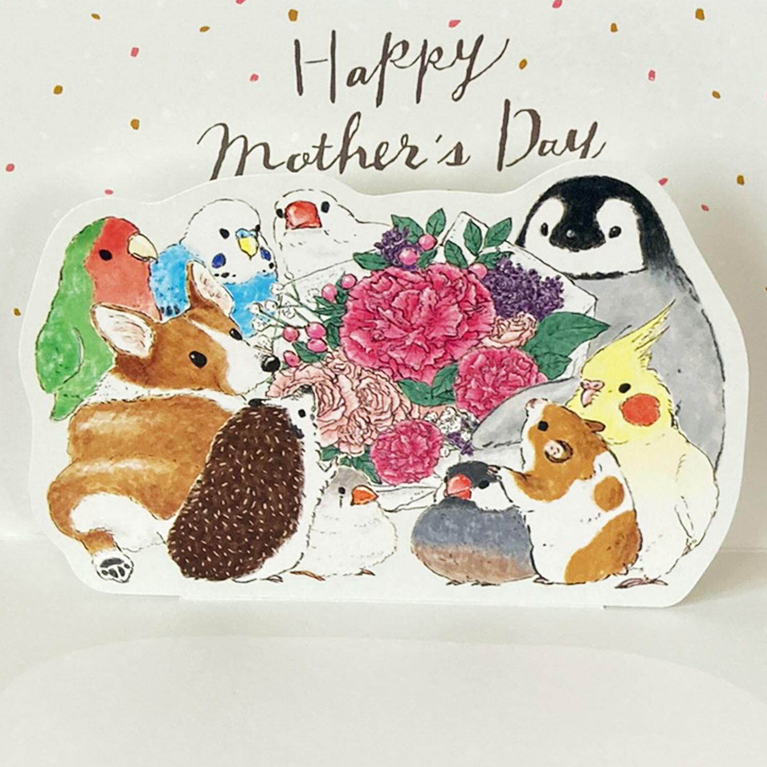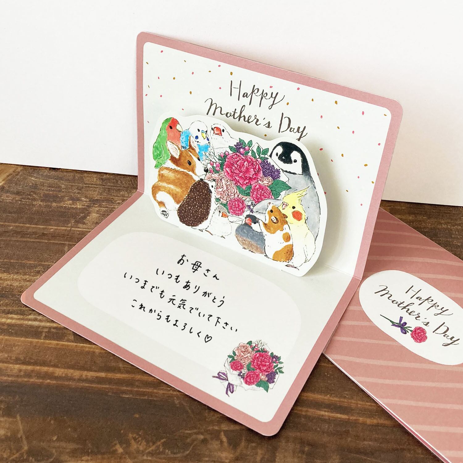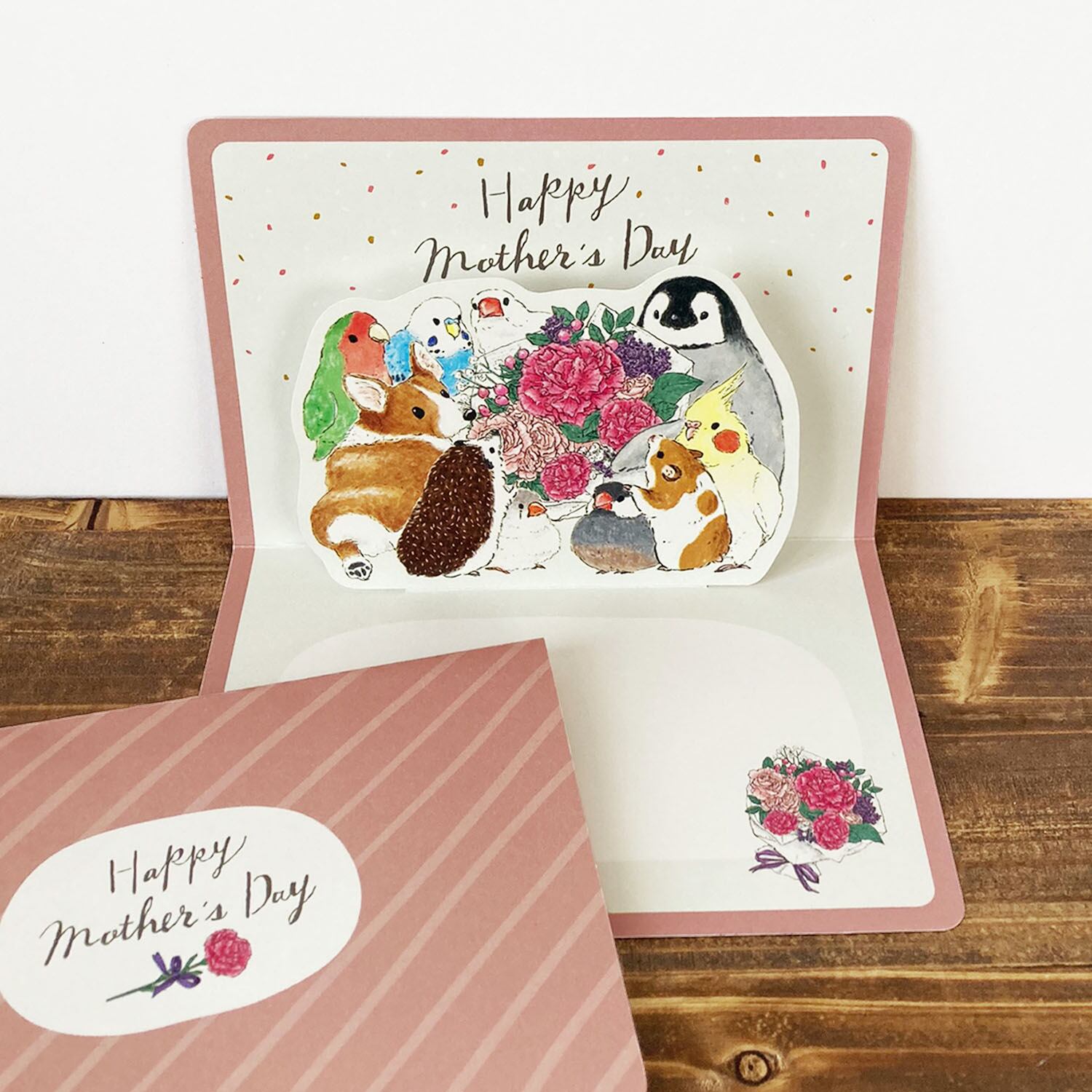 大きな花束をアニマル達が囲んでいる母の日カードです。カードを開くとイラスト部分が飛び出す、簡単な仕掛けがあります(^^)
