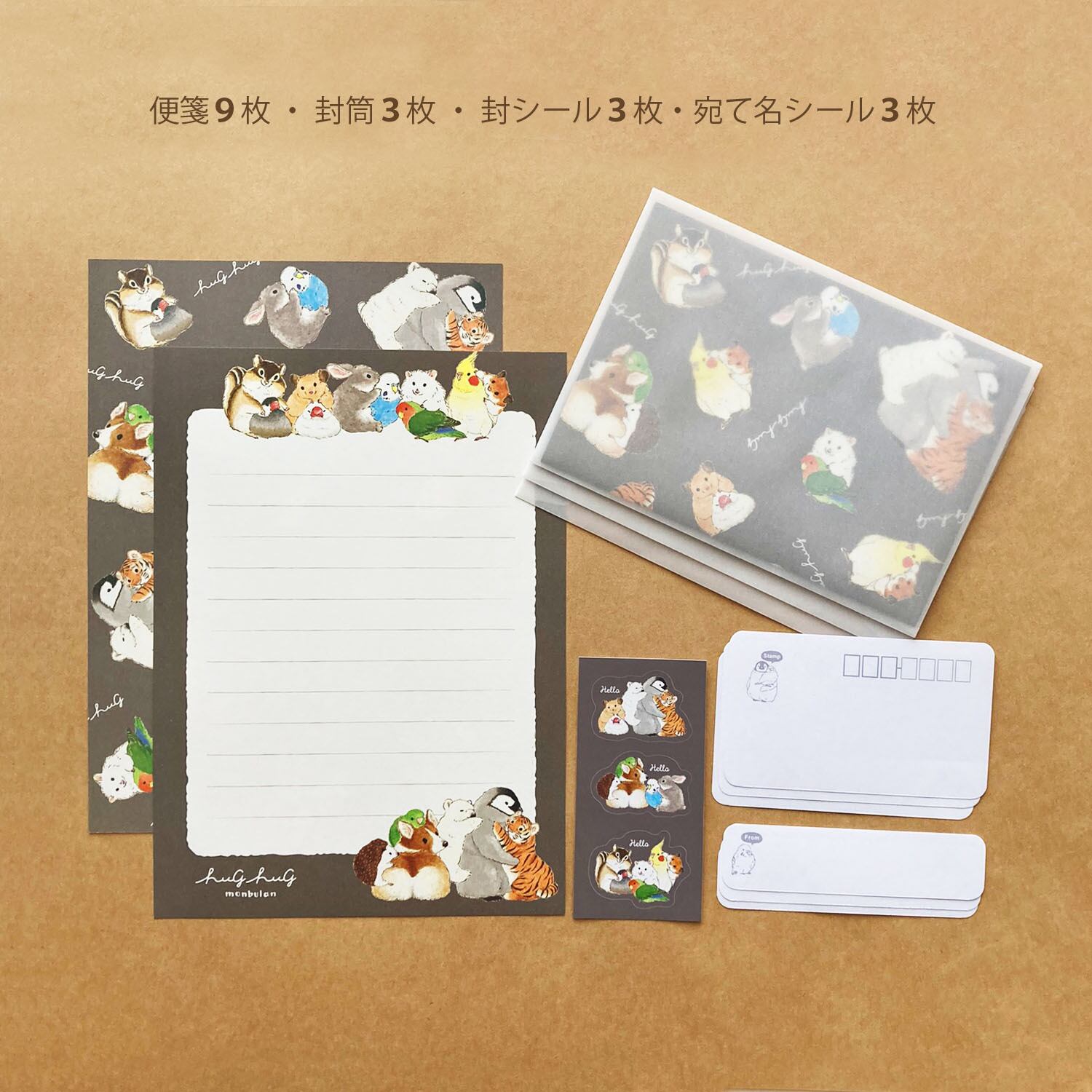 アニマルたちがみんなでハグしているレターセットです(^^)