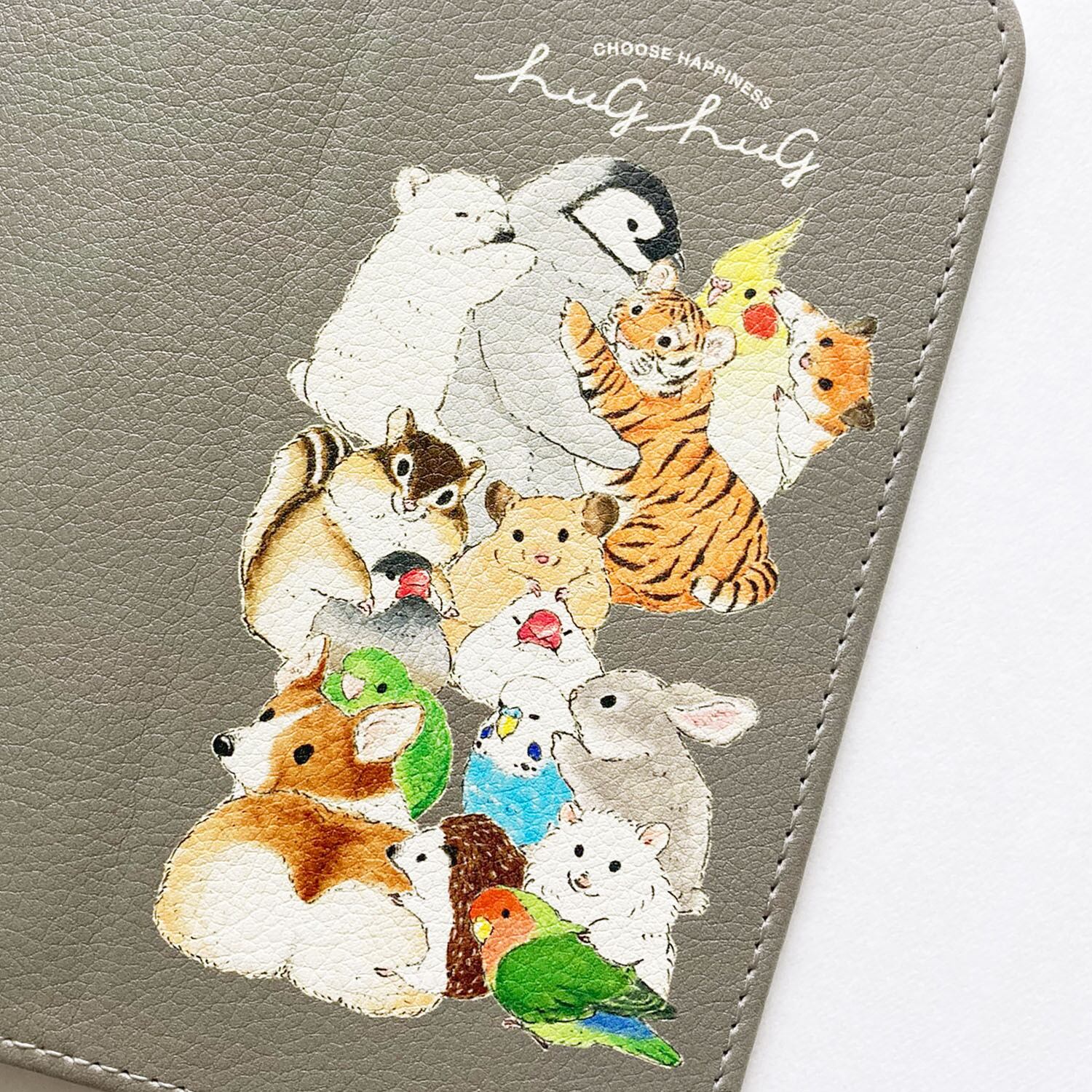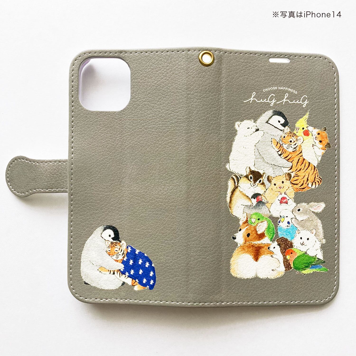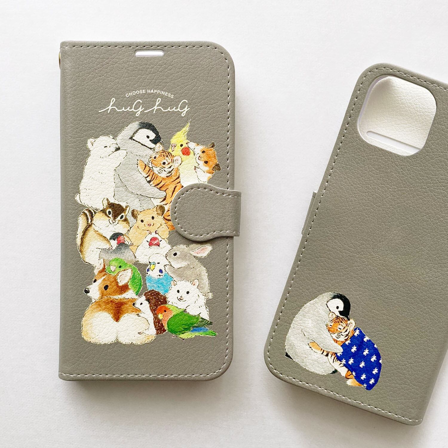 アニマルたちがみんなでハグしている手帳型スマホケースです。