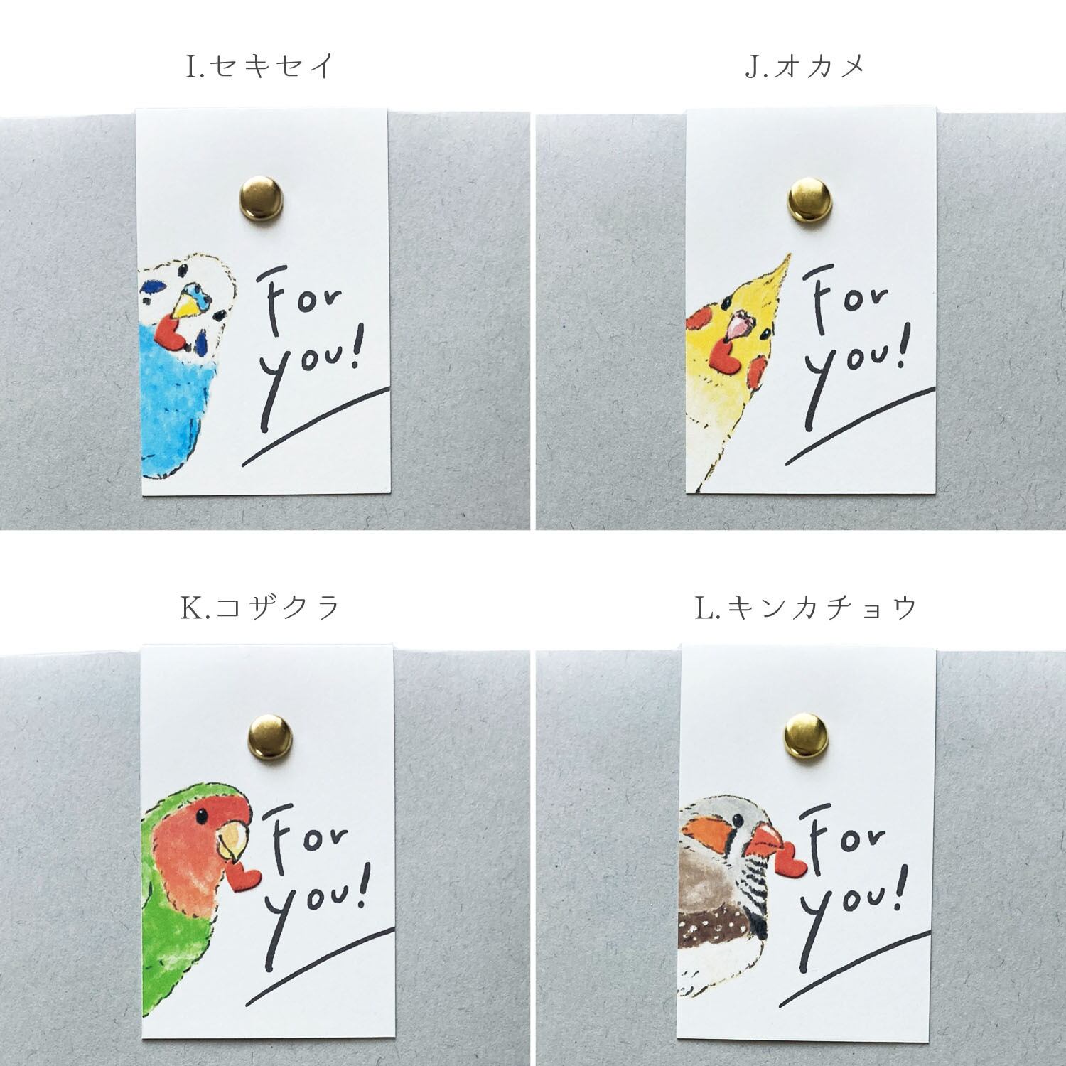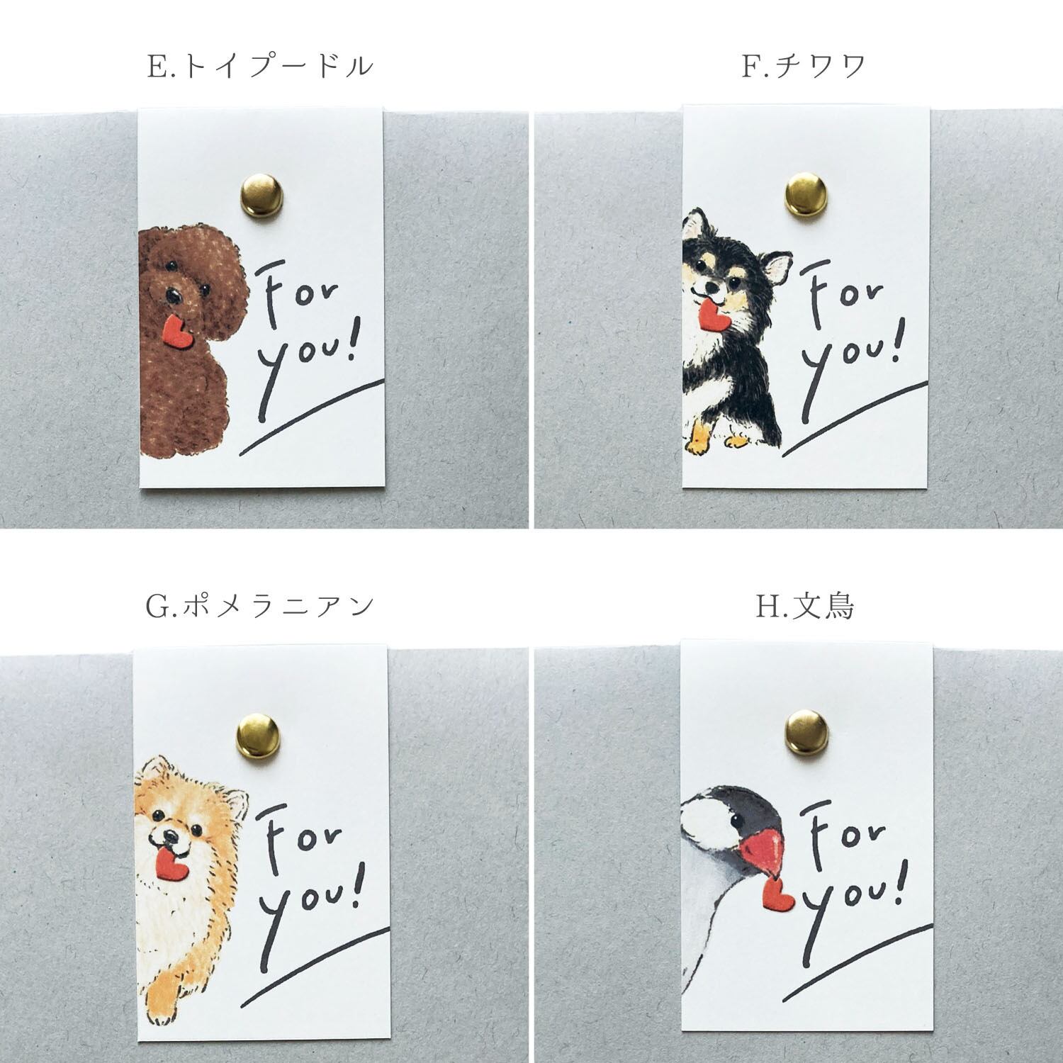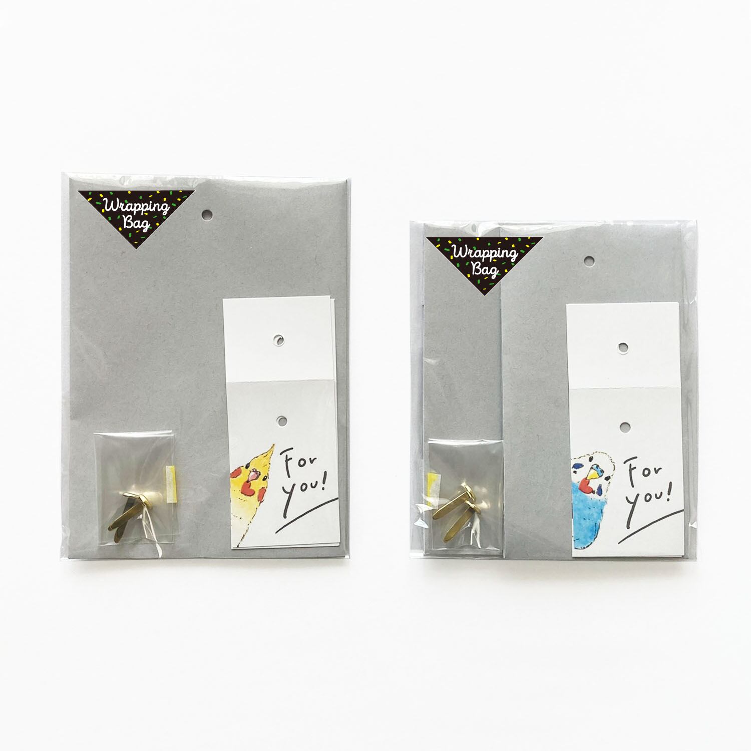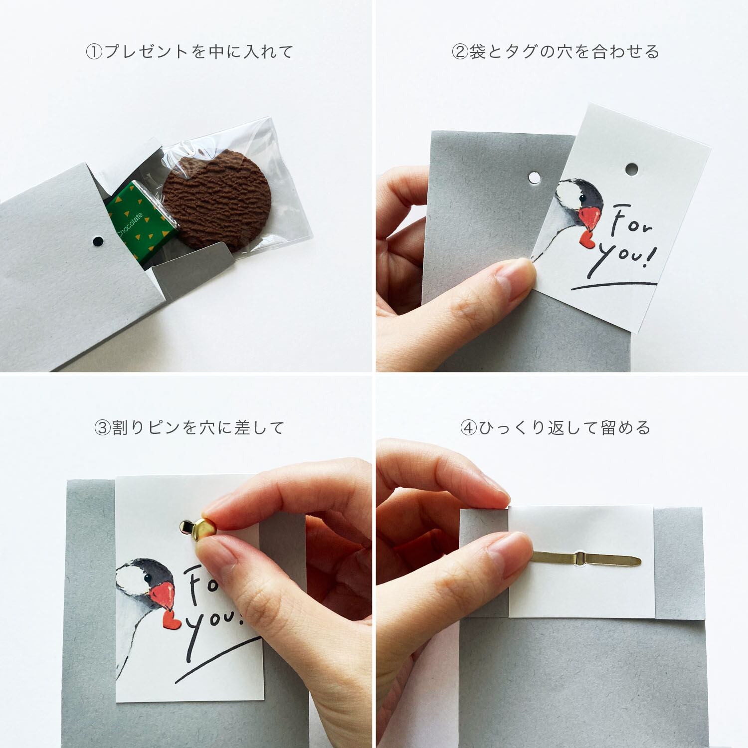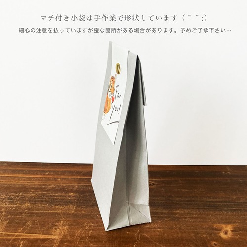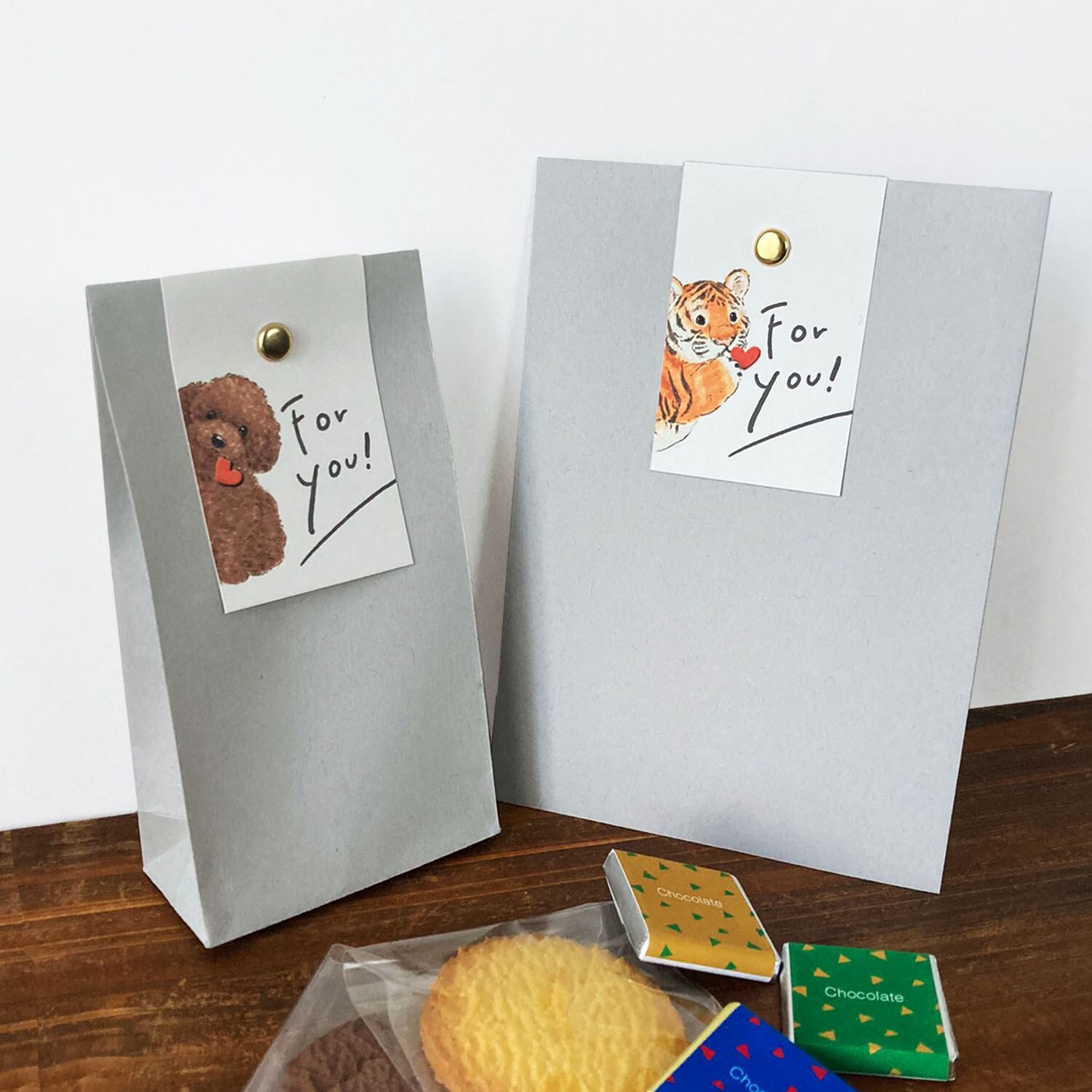 紙袋は「マチあり」と「マチなし」の2種類、紙タグは12種類ご用意しました。グレーの紙袋に白の紙タグ、ゴールドの割りピンで落ち着いた雰囲気になっています。バレンタインや小さなちょっとしたプレゼントの際は、どうぞご活用ください!