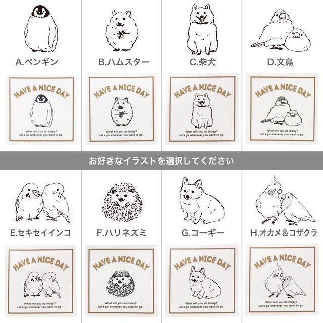 ラベルは、ペンギン・ハムスター・柴犬・コーギー・文鳥・インコ・ハリネズミをご用意しました。